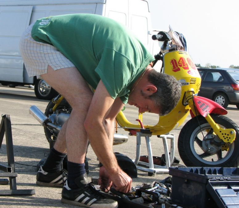 This months pic was taken by Jamie (my Son) and is one of a series of photo's he took of Darreyl Ward carrying out repairs to his Lambretta at Elvington. The day was so hot Darreyl thought it a good idea to strip out of his leathers and was seen by everyone testing up and down the pits in just his boxers. It brought a smile to more than one face
